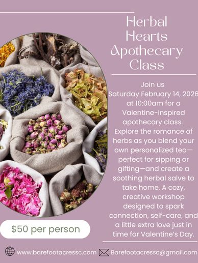 Explore the romance of herbs as you blend your own personalized tea-perfect for sipping or gifting-and create a soothing herbal salve to take home. A cozy, creative workshop designed to spark connection, self-care, and a little extra love just in time for Valentine's Day.